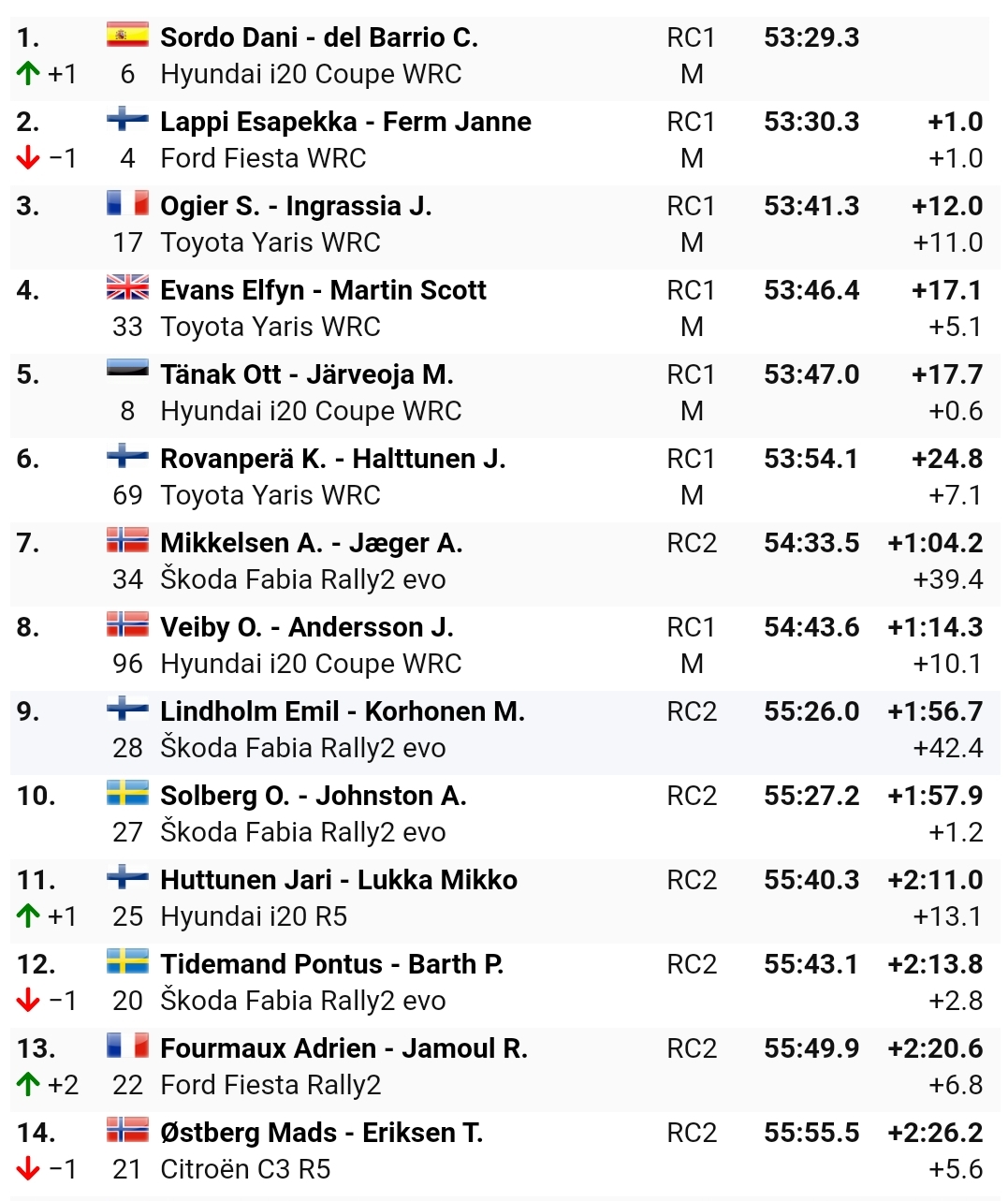 Col settimo tempo, molto in sordina, il francese Sebastien Ogier che potrĂ  essere il vero ago della bilancia nella giornata di domani. Concludono in top10 il norvegese Veiby, gran prova di carattere per la sua prina apparizione su una WrcPlus, Fourmaux e Mikkelsen.