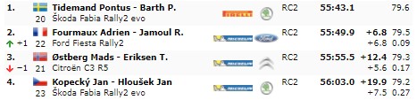 Il pilota Toksport dopo un’avvio prudente alza i giri nelle due prove Cinturato, vincendole entrambe ed approfitta della foratura di Adrien Fourmaux (Ford Fiesta rally2) per portarsi al comando della classifica. Secondo posto occupato proprio dal pilota transalpino, autore di quattro scratch, è attardato dallo svedese di appena 6”8. In leggera difficoltà Mads Ostberg (Citroen C3 R5) che occupa la terza piazza staccato di 12”4 da Tidemand. Chiude in quarta posizione il rientrante Jan Kopecky (Skoda Fabia rally2) a 19”9.