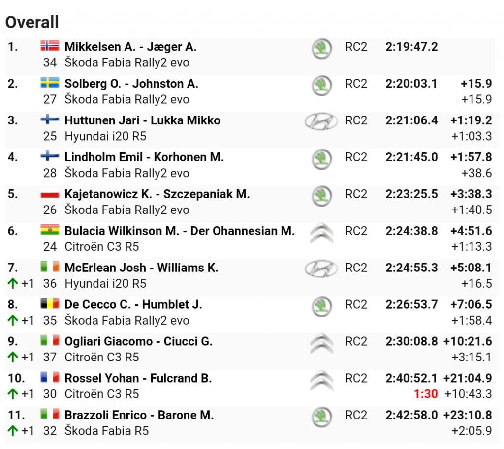 Chiude il podio come detto il veloce Jari Huttunen, mentre in quarta posizione troviamo la Skoda Fabia Rally2 Evo di Emil Lindholm, staccato dalla vetta di quasi due minuti. Terminano in quinta e sesta posizione la Skoda Fabia di Kajto Kajetanowicz e la Citroen C3 R5 di Marquito Bulacia. Il primo era chiamato ad una gara tutta d’attacco per recuperare i 15 punti che lo separavano dal titolo, mentre dal secondo ci sia aspettava sicuramente di più in quanto doveva difendere la sua leadership in campionato.