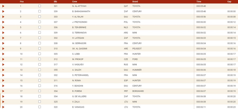 Ecco la classifica dei primi 20, mentre quella completa potete leggerla dal sito della Dakar