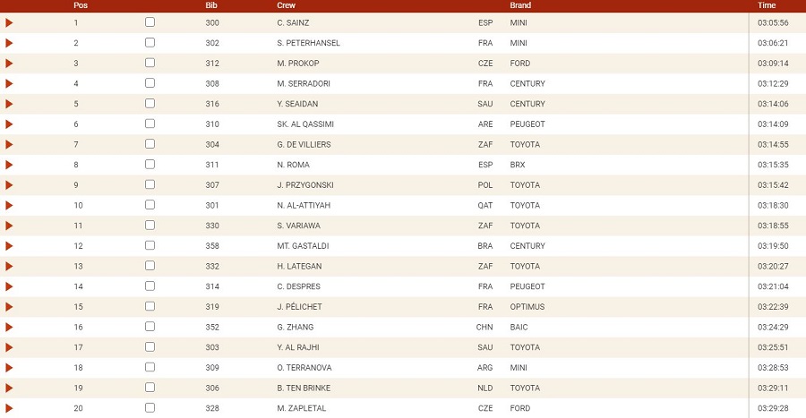 Mentre sugli 11km di ieri Sainz aveva faticato non poco a causa di una foratura, oggi lo spagnolo è partito ventre a terra, dominando la tappa fin dal terzo waypoint e alternandosi da quel momento con il compagno di squadra Peterhansel fino a fine prova. I due assi del team Mini X-Raid, divisi alla fine da 25 secondi, hanno fatto il vuoto dietro di loro, con il solo Martin Prokop a seguirli con un ritardo contenuto in 3 minuti e 18 secondi.