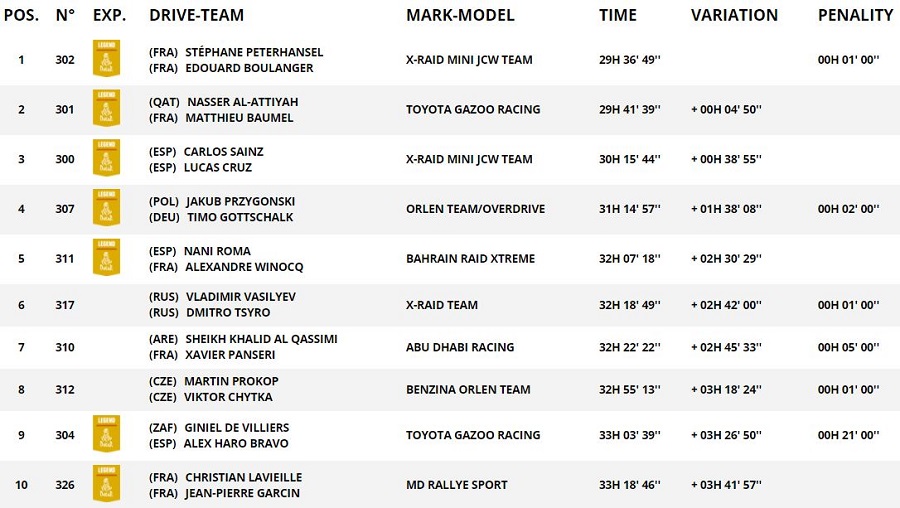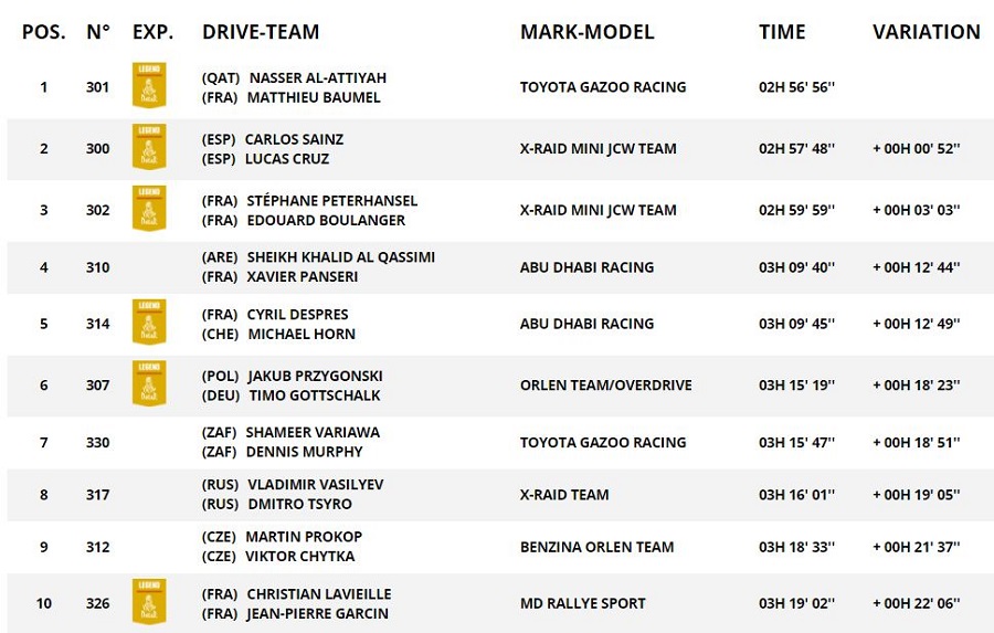 Non sorprende quindi che sia stato proprio il pilota del Qatar a far sua questa tappa, riducendo il distacco a 4 minuti e 50 secondi e riaprendo del tutto la gara quando ancora mancano 4 tappe all’arrivo a Jeddah. Secondo oggi e terzo incomodo nella lotta per la vittoria finale, Carlos Sainz può solo sperare che agli altri due capiti qualcosa: infatti riprendere 39 minuti in 4 tappe a due piloti come Peterhansel e Al-Attiyah è veramente troppo anche per il matador.