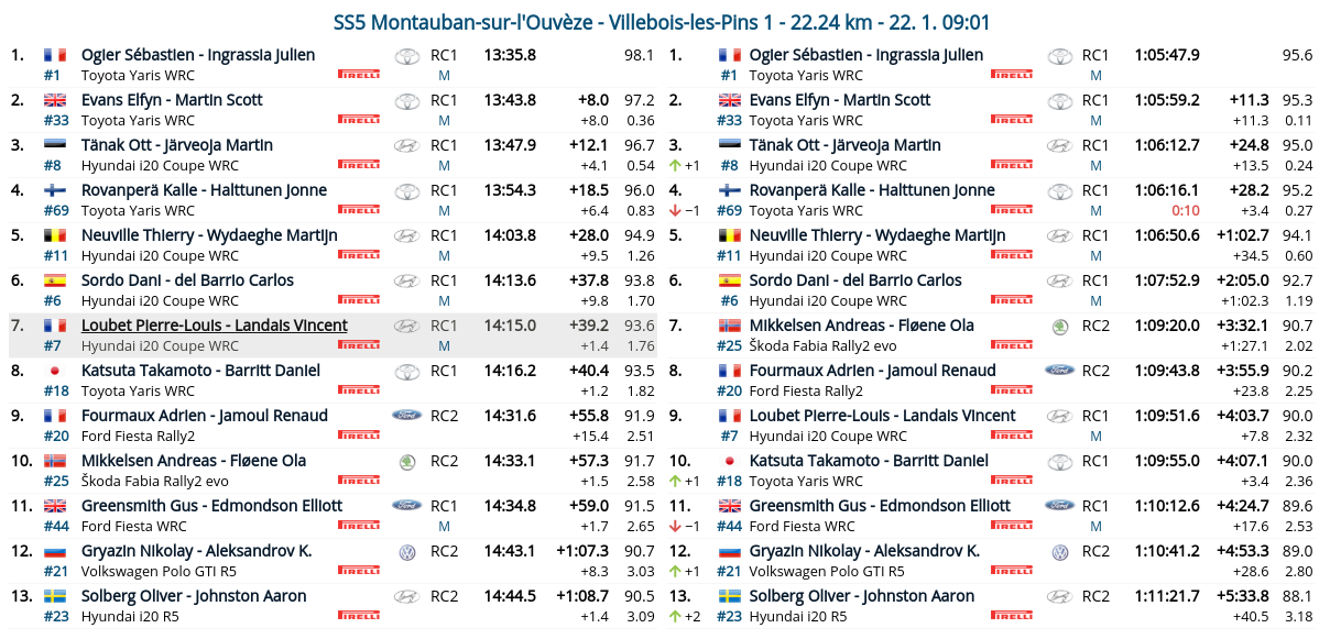 I primi squilli arrivano dal duo campione del mondo in carica Ogier – Ingrassia che vincono le speciali al “crescere del sole” (ndr. sì fa per dire, dato il cielo coperto e che minaccia perturbazioni) e, dopo la prima prova di giornata, guadagnano la vetta della classifica generale a seguito della SS4 Chalancon – Gumiane 1 da 21.62 km. Lo fanno grazie ad un’ottima seconda parte di prova, giudicata “molto bella” dallo stesso Ogier, ed anche grazie ad una penalità di dieci secondi inflitta al compagno di squadra Kalle Rovanpera in seguito ad un ritardo di un minuto al controllo orario. Piccola imprecisione per il finlandese che aveva approcciato la SS3 con il piglio del veterano, staccando il terzo tempo alle spalle proprio dei compagni Ogier ed Elfyn Evans. Il pilota britannico è parso quello meno a suo agio dei tre ma comunque con tempi importanti e nelle posizioni che contano.