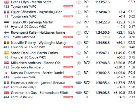 Sui 19.76 chilometri della prima prova del pomeriggio, avviene un ribaltone al comando della gara. SĂ©bastien Ogier perde il comando della gara a causa di una foratura all’anteriore sinistra. Questa foratura lo porta a commettere altre due sbavature, da prima urta un piccolo banco di neve e successivamente va in testa-coda. Errori che gli costano piĂą di 30” di ritardo da Elfyn Evans, vincitore della prova e nuovo leader della gara. L’elfo conduce una prova tutta all’attacco facendo fermare i crono sul 13’32”. Buono anche il riscontro cronometrico di Ott Tanak, che approfitta dell’errore di Ogier per scavalcarlo al secondo posto. Segni di risveglio da parte di Thierry Neuville e Dani Sordo, che firmano il quarto e quinto tempo di prova. Errore anche per Kalle Rovanpera, che su un taglio poco dove il via (circa 500-600 metri) perde il controllo della Yaris, lasciando per strada 47”. Tra le rally2 continua la gara d’attacco di Andreas Mikkelsen (Skoda Fabia rally2) che fa segnare il sesto tempo di prova.