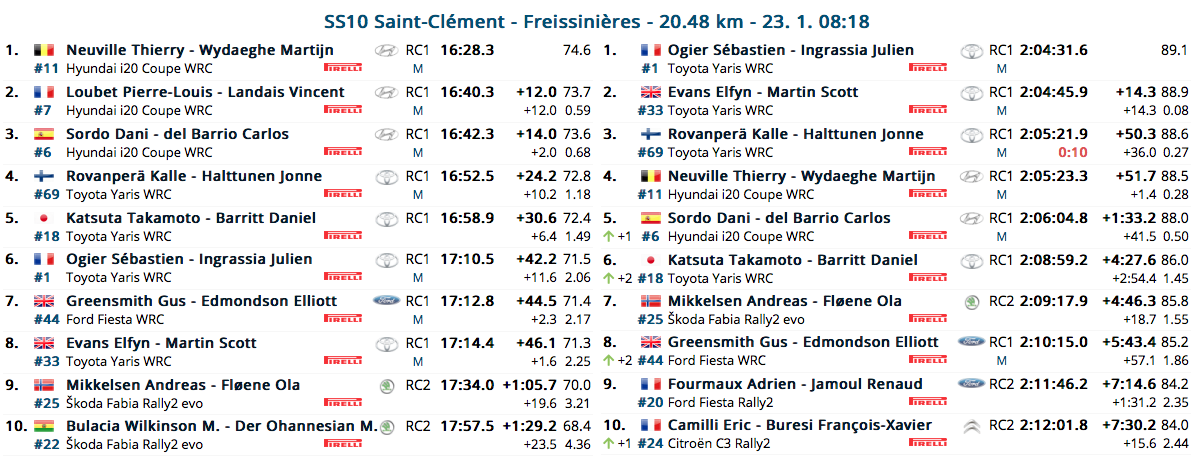 Sulla seconda speciale di giornata, la Saint-Clément – Freissinières di 20.48 km, è invece il fondo completamente innevato ad accogliere i concorrenti e si manifesta l’imprevedibilità del Monte. Contro ogni pronostico infatti è Thierry Neuville a staccare il miglior tempo distanziando tutti. Il belga rifila 12 secondi a Loubet e 14 a Sordo. Faticano invece Ogier e Evans che perdono rispettivamente 42 e 46 secondi. La coppia Toyota, così come il compagno Rovanpera, denunciano una totale mancanza di grip. I tempi, in generale, sono andati via via peggiorando e questo fa ipotizzare come probabilmente le condizioni del fondo siano cambiate dopo i primi passaggi, favorendo così chi partiva per primo. Ma si sa, il Monte è anche questo. Da segnalare i problemi incontrati da Ott Tanak: l’estone si è ripetutamente fermato in prova speciale e al controllo stop il problema si è rivelato essere nuovamente una foratura.