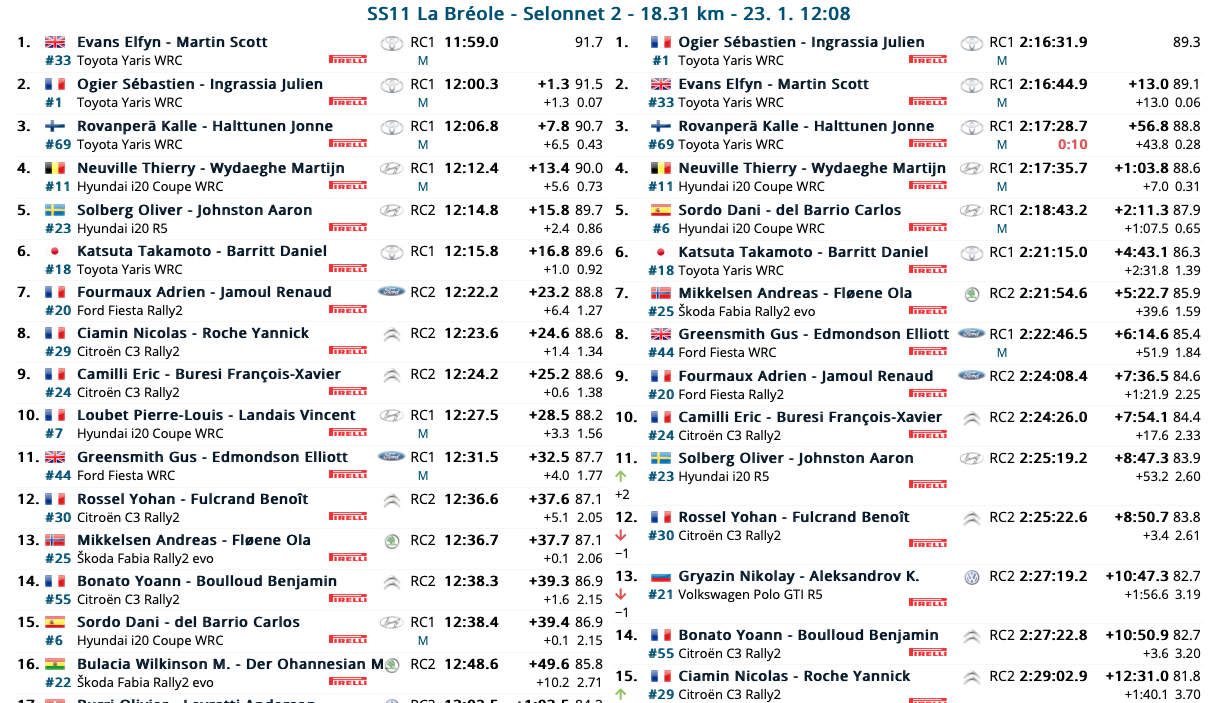 Dopo la prima “Breole-Selonnet”, rivelatasi sì, insidiosa, ma non troppo, è il secondo tratto cronometrato invece ad aver imposto maggiori differenze. Sui 20.48km di Saint-Clèment – Freissinières, infatti, è stato il belga di Hyundai Motorsport Thierry Neuville ad essersi imposto, rifilando 12” a Loubet e ben 24” al piĂą vicino Rovanpera, con rispettivamente 42” e 46” pagati da Ogier ed Evans su condizioni rivelatesi insidiosissime per le vetture nipponiche.
