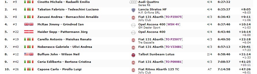 Michele Cinotto e Emilio Radaelli avevano compiuto il loro capolavoro, dominare il Costa Smeralda dall’inizio alla fine, conducendo le operazioni per tutte le quaranta prove previste. Al secondo posto chiuse Fabrizio Tabaton con la “vecchia” Stratos a otto minuti, mentre terzo ad oltre nove minuti dal vincitore Andrea Zanussi. Ottima la prova del rientrante Antonio Carello, su Fiat 131 Abarth della Tre Gazzelle, che tornava a calcare le strade del Campionato Italiano dopo oltre quattro anni. Decimo chiude un altro giovane, anche lui proveniente come Cinotto dal mitico Trofeo A112, stiamo parlando di Carlo Capone navigato da un’altra icona del rallysmo tricolore Gigi Pirollo.