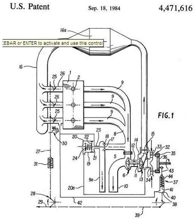 Nel sistema descritto a brevetto il cilindro (38) è collegato direttamente all’acceleratore (28) tramite il braccio (39). La camera interna di questo cilindro è invece messa in comunicazione (tramite 42) direttamente con il condotto di aspirazione a valle delle valvole a farfalla (25). All’interno del cilindro è presente un pistone (41) e una molla (44) che viene caricata e spinta dal pistone sotto l’azione dalla pressione presente in camera (40), ovvero quella all’aspirazione. In questo modo l’azione sull’anello (36) è una combinazione delle azioni date dal pedale dell’acceleratore e dalla pressione nel condotto di aspirazione.