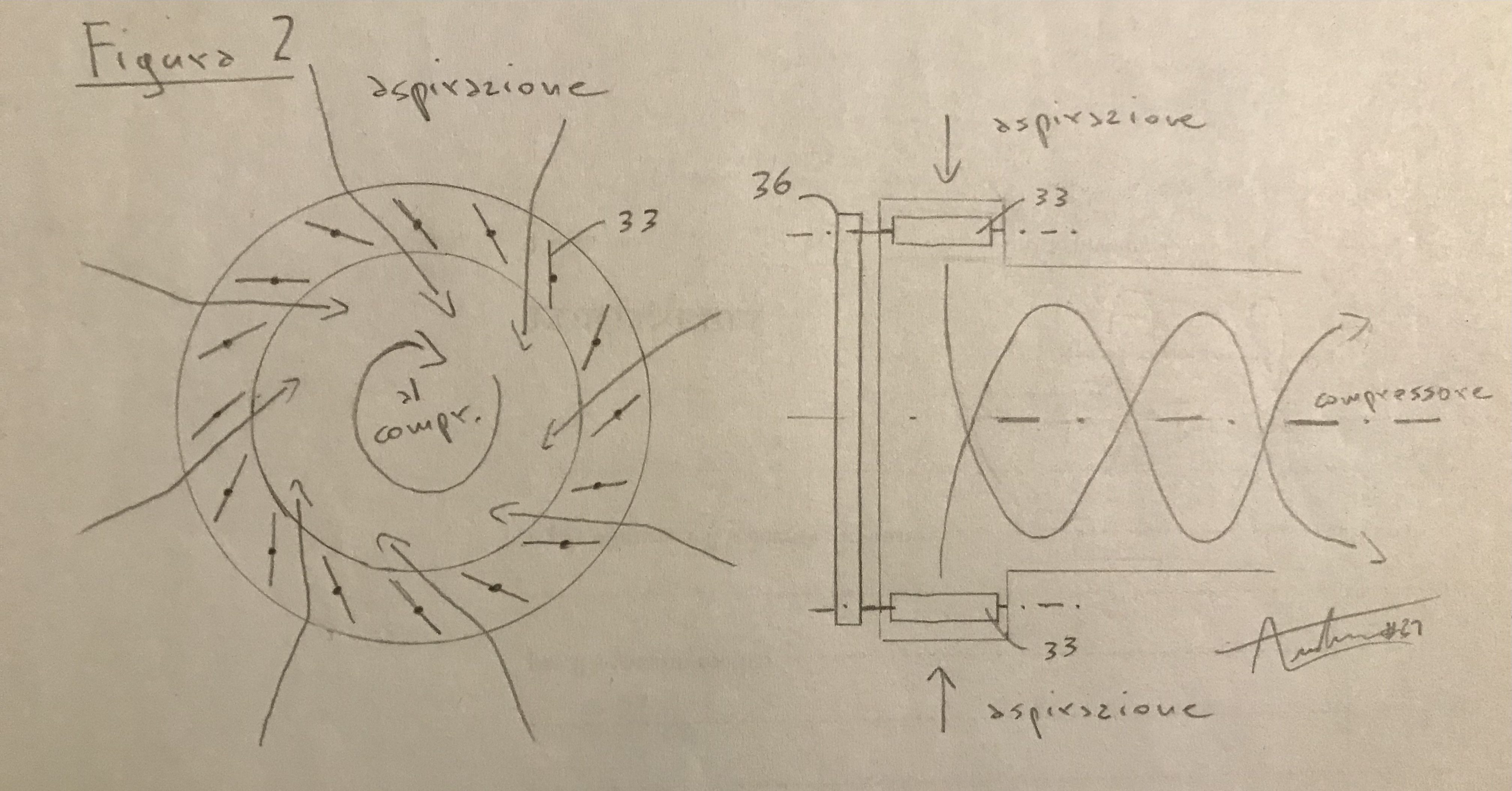 Alla bocca di ingresso del compressore viene abbinato un dispositivo (32) che ha il compito di variare la sezione di passaggio dell’aria aspirata e anche la direzione del flusso stesso. Il dispositivo è composto da una serie di palette (33) disposte radialmente lungo la bocca di aspirazione (34), che possono ruotare ognuna sul proprio asse (35). Le palette possono essere messe tutte in rotazione contemporaneamente dall’anello (36). Questo anello è messo a sua volta in rotazione dalla bielletta (43), che fa parte del cilindro (37). In questo video potete vedere bene la bielletta (43) che mette in rotazione il disco (36).