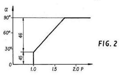 Nel momento in cui il pilota torna sul gas il cilindro (38) torna ad essere spinto in avanti, ma le palette non vengono messe in posizione “tutto aperto” bensì in una posizione intermedia. Manca infatti il contributo della pressione in camera (40), perchè la pressione all’aspirazione è ancora bassa (abbiamo appena aperto il gas). In questo modo si mantiene una componente con effetto rotativo sul compressore, ma comincia ad aumentare leggermente l’area di passaggio per preparare il compressore alla fase successiva. Ci troviamo nella zona (45) del grafico in figura sotto: la pressione di sovralimentazione è costante e le palette sono inclinate di 30° circa.