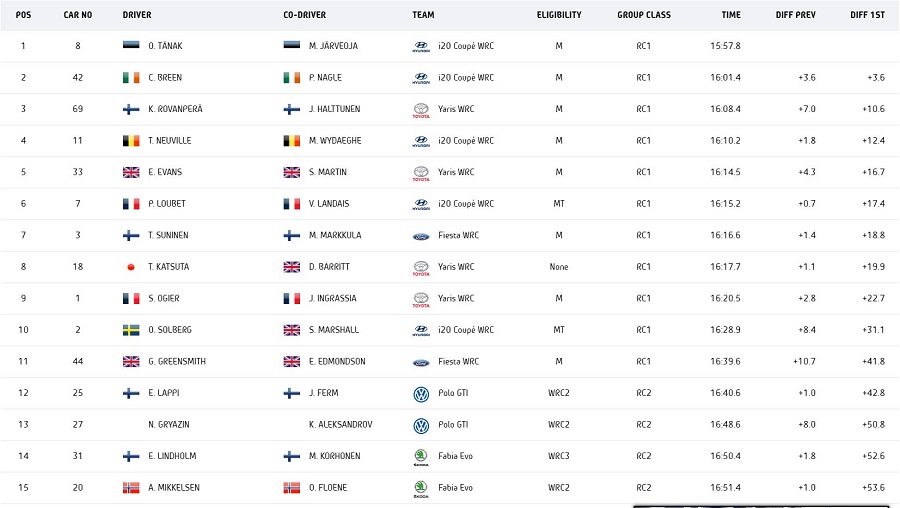 Quarto e quinto Neuville ed Evans, che comunque pagavano la posizione di partenza, mentre ottimo il sesto tempo di Loubet. Non altrettanto veloce ma comunque ottima la prestazione di Oliver Solberg, decimo su questa prima prova, ma con l’attenuante di un testacoda che gli ha fatto perdere almeno 10 secondi.