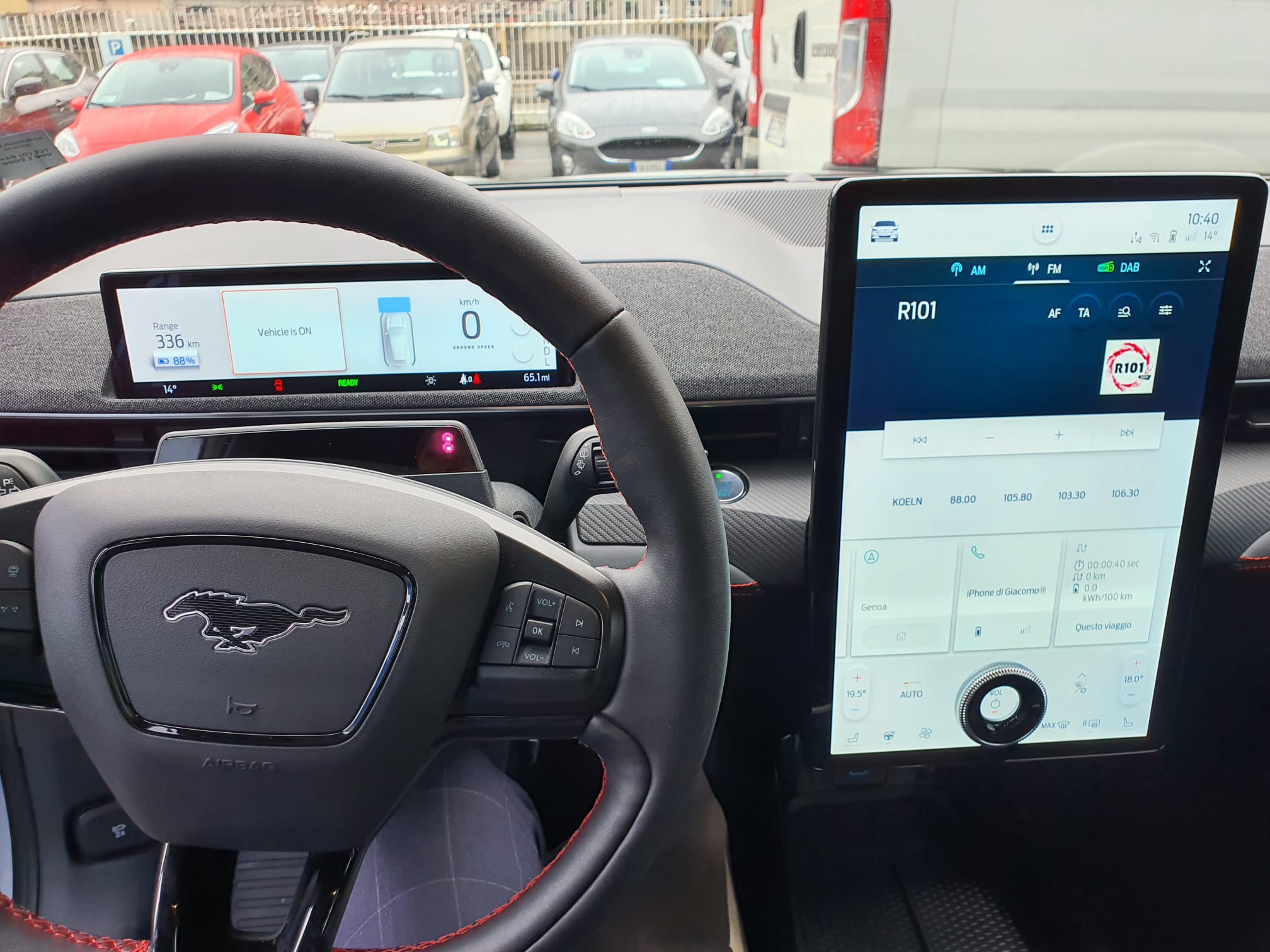Pregevole il volante in pelle riscaldata dal target racing con il cavallo Mustang ben visibile, che antepone il cruscotto digitale da 10,2” adibito a mostrare digitalmente la strumentazione e le principali informazioni di guida.