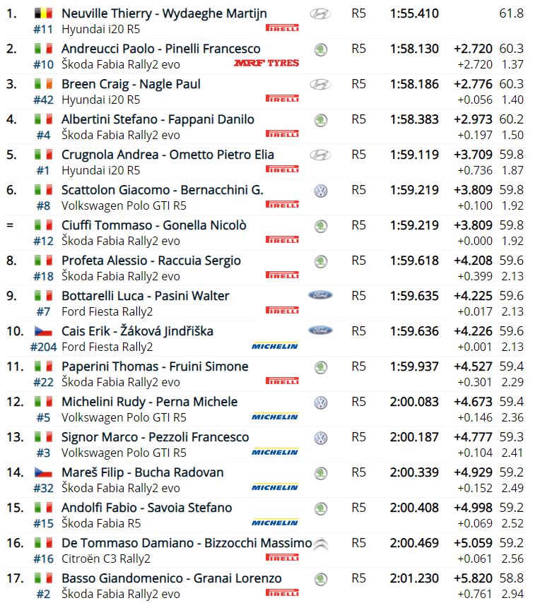 Al quarto posto un ottimo Albertini, primo nella classifica riservata al CIRA e in forma smagliante. A seguire il campione in carica Crugnola poi Scattolon e Ciuffi. Attardato al 17° posto, ma solo a 5,8 secondi dalla testa, Giandomenico Basso ha dovuto fare i conti con un problema al launch control della sua Fabia, ma avrà tutta la giornata di domani per rifarsi.
