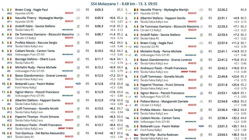 In quinta posizione c’è la Hyundai I20 dell’irlandese Craig Breen. Il pilota ufficiale del team di Alzenau è colui che ha vinto 2 prove su 3 stamattina ma ha pagato purtroppo un brutto tempo sulla PS3 Careggine 1, concludendo con un ritardo di oltre 14 secondi e costretto quindi a rimanere ancora nelle retrovie della classifica generale. Sesta e settima piazza occupate da Rudy Michelini e dalla Skoda Fabia di Giandomenico Basso, il quale sta faticando più del previsto mentre chiudono la top10 il pluricampione italiano Andreucci, e i giovani Ciuffi e Paperini.