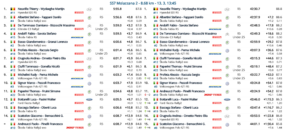 Con un giro di prove sulle spalle e qualche km in più con la i20 R5, Neuville ha iniziato a prendere le misure alla gara e i risultati non si sono fatti attendere: tre prove vinte su 3, di cui una però in coabitazione con uno strepitoso Albertini che rimane l’unico ad impensierire il forte pilota belga e a rimanergli agganciato a 7,2 secondi. Non pochissimo ma un distacco sufficiente per potergli consentire di sfruttare eventuali errori dell’ufficiale Hyundai.