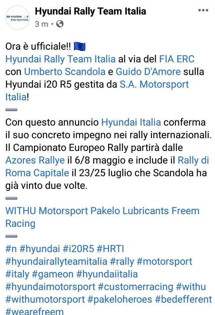 Con un post sulle pagine social della squadra, Hyundai Italia Team ufficializza la loro partecipazione all’ERC2021.