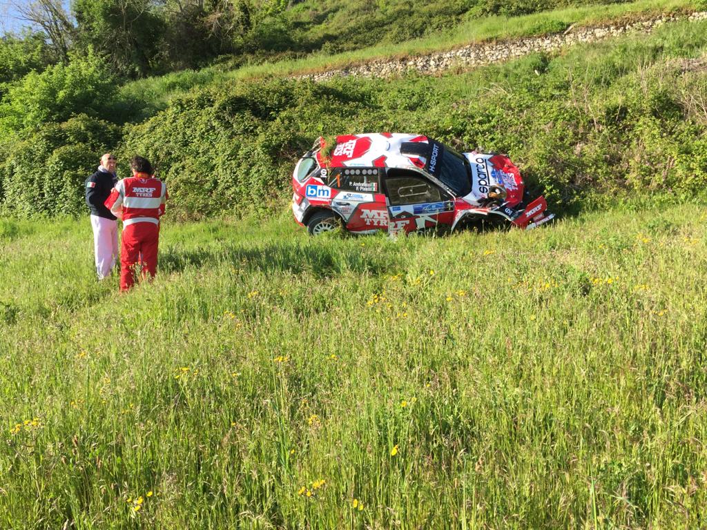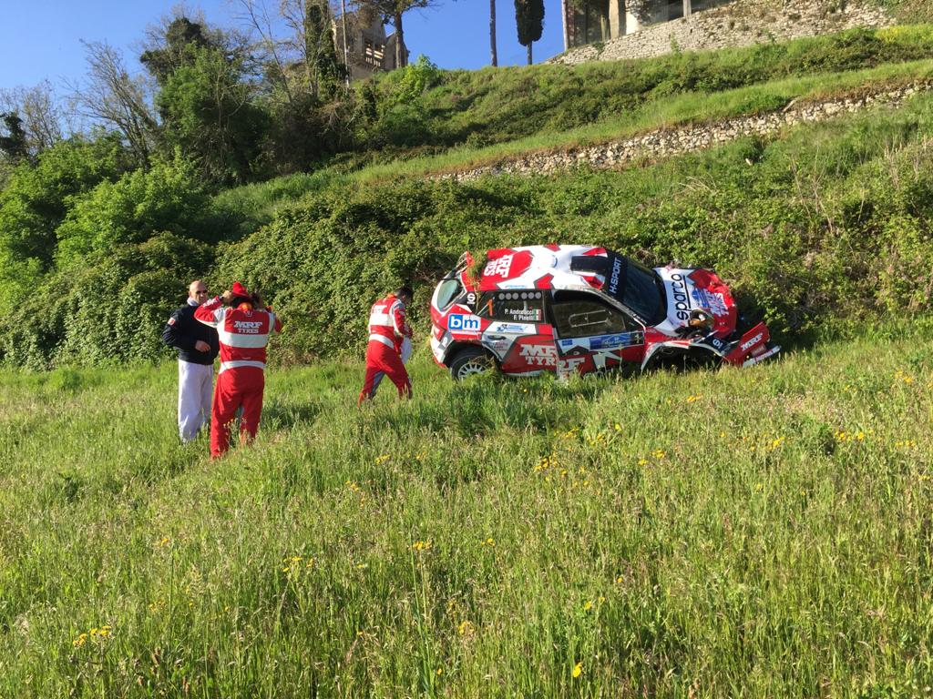 L’equipaggio è uscito indenne dalla vettura ma la PS è stata sospesa, con carro attrezzi ed ambulanza entrati in speciale per l’incidente di Pierangioli.