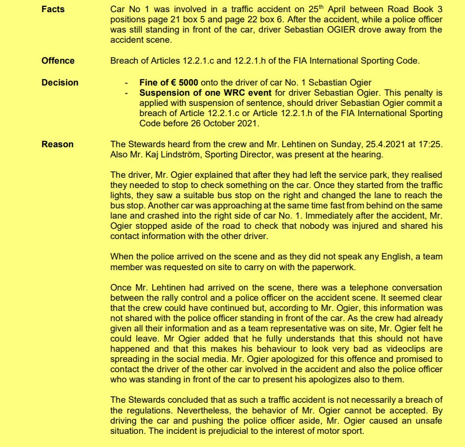 I Commissari di gara hanno concluso che un incidente stradale non è necessariamente una infrazione delle regole. Ciò nonostante, il comportamento di Ogier non può essere accettato. Partendo con l’auto e spingendo via un agente di polizia, Ogier ha causato una situazione di pericolo. Questo episodio è contrario all’interesse del motor sport.