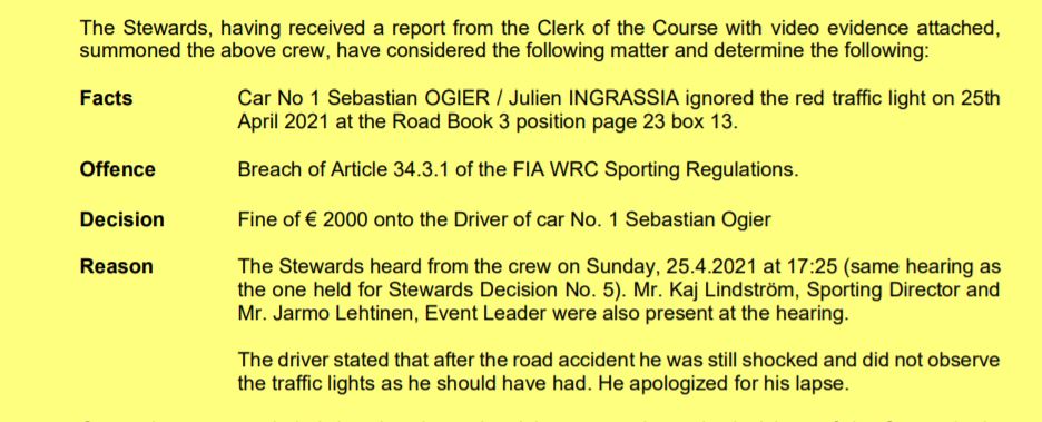 Car No 1 Sebastian OGIER / Julien INGRASSIA ignored the red traffic light on 25th April 2021…