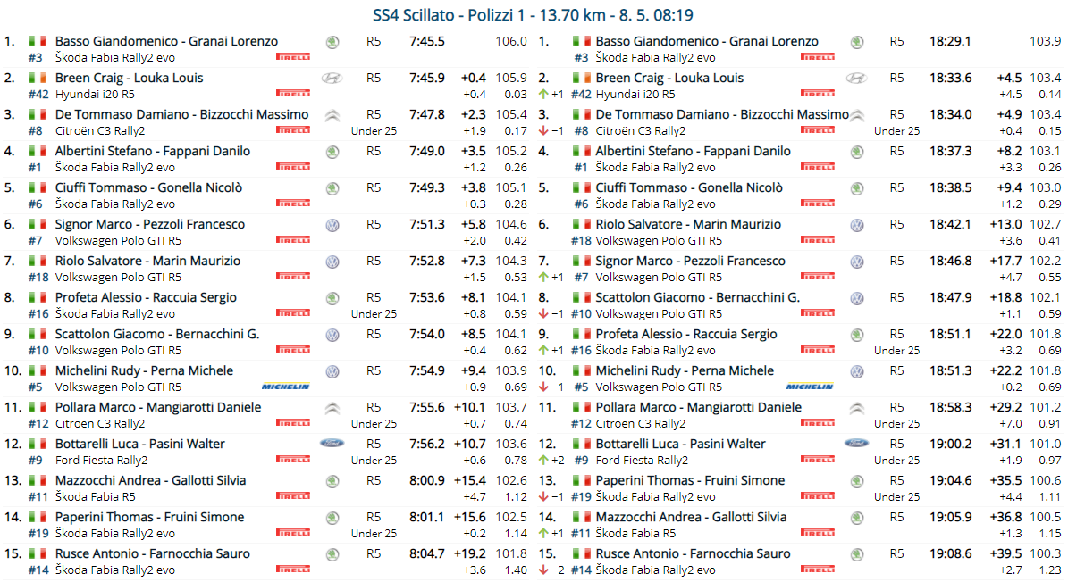 Il miglior cronometro dei piloti in gara è quello staccato da Giandomenico Basso a bordo ovviamente della sua Skoda Fabia Rally 2 Evo. Il campione veneto va subito all’attacco, scala la classifica e si porta subito in seconda piazza. Lo segue a ruota, staccato solo di qualche millesimo, Salvatore Riolo (VW Polo R5). A completare il podio l’attuale leader della gara, Damiano De Tommaso (Citroen C3 Rally2). Sfida avvincente con tre vetture differenti nelle tre posizioni.