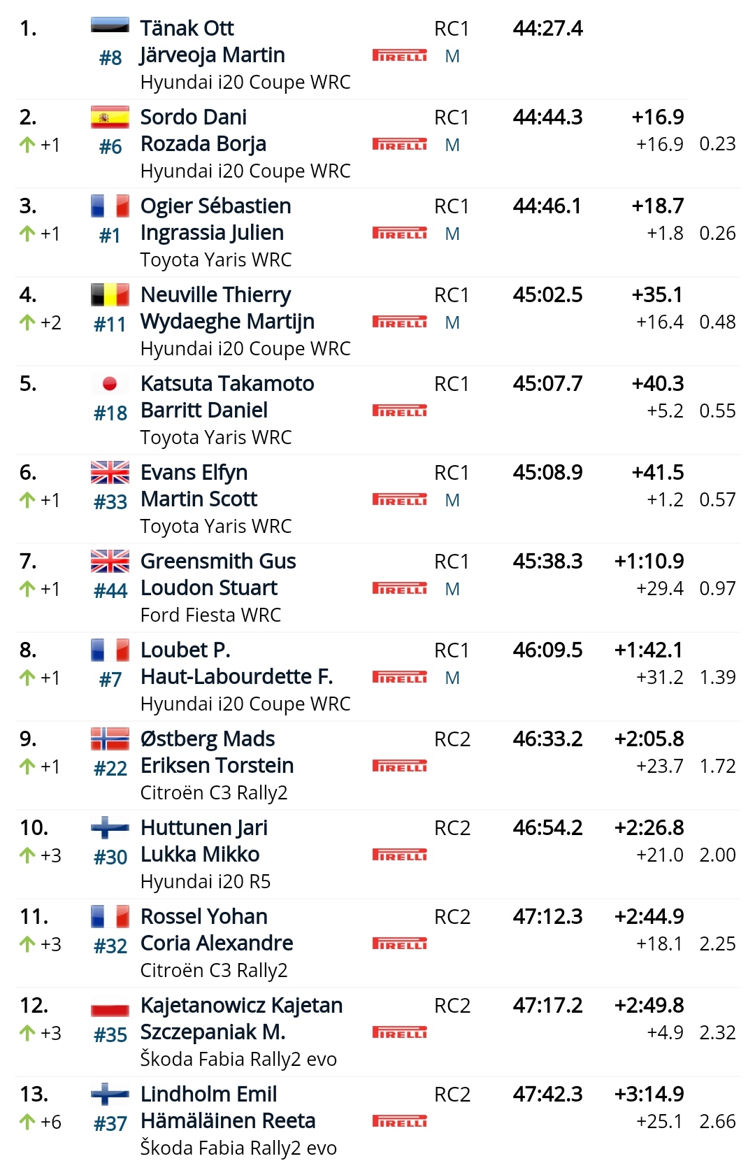 Ott Tanak ha segnato i migliori tempi su tutte e 4 le prove speciali, conducendo un passo gara davvero impressionante lasciandosi alle spalle un ottimo Dani Sordo (+16.9) anch’egli molto abituato a fare buoni risultati qui in Sardegna, dove è riuscito a conquistare una vittoria qui proprio due anni fa. Le temperature e le condizioni delle strade come si sa sono molto difficili ma le Hyundai hanno saputo gestire e resistere a tutte le incombenze del caso.