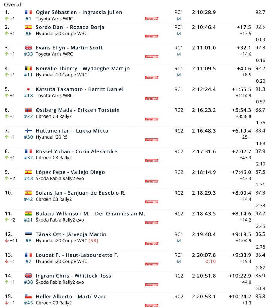Sordo è stato invece costretto a cedere la posizione ad un ben più performante Sébastien Ogier. Le prestazioni del campione del mondo in carica sono state per tutta la mattinata migliori rispetto a Sordo, ma il sorpasso è stato anticipato da un guado preso in maniera troppo aggressiva dallo spagnolo sulla Coiluna Loelle 1. L’acqua ha causato uno stallo del motore e la perdita di preziosi secondi, facilitando la rimonta e minando la sicurezza di Dani.