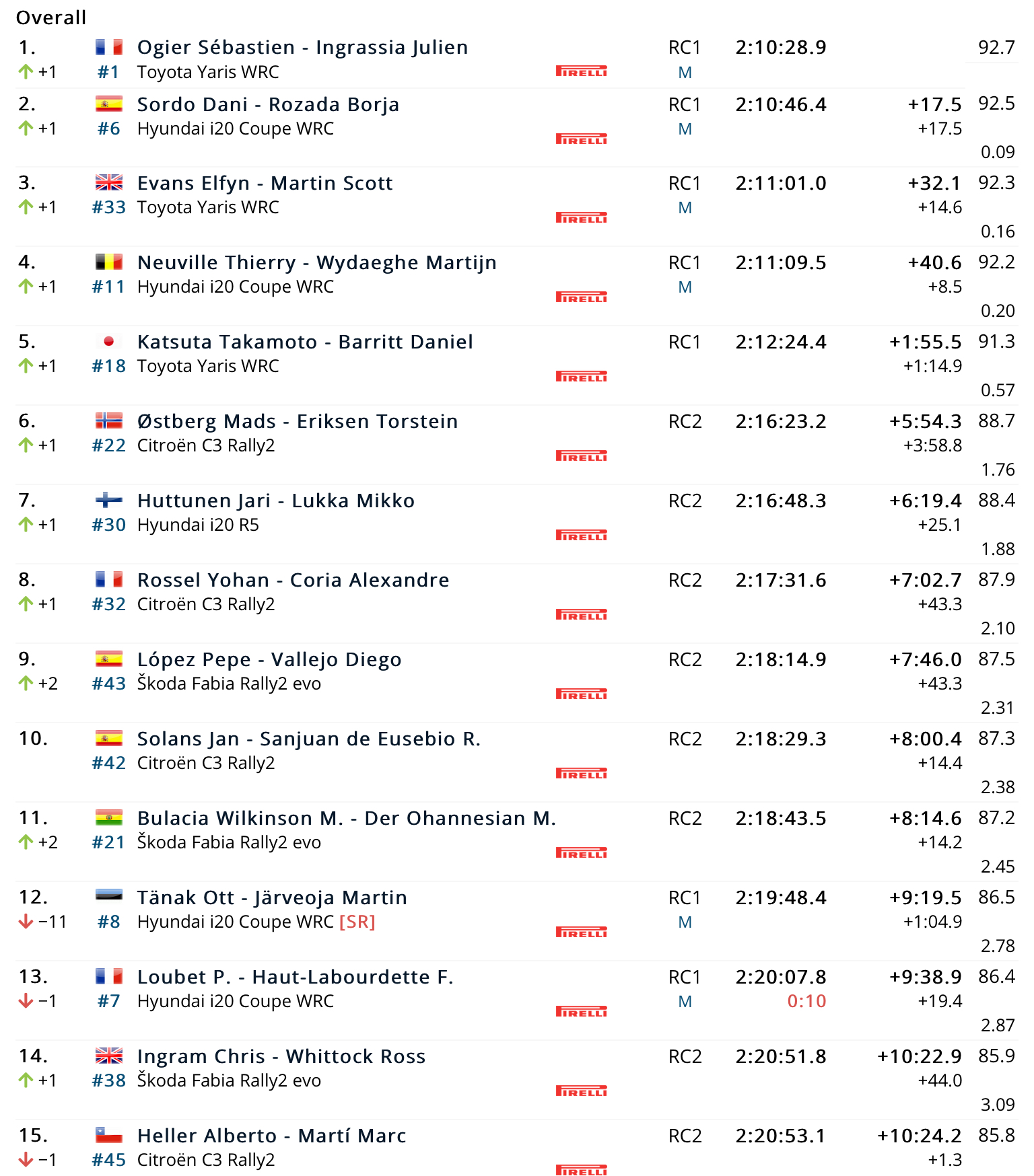 Sordo è stato invece costretto a cedere la posizione ad un ben più performante Sébastien Ogier. Le prestazioni del campione del mondo in carica sono state per tutta la mattinata migliori rispetto a Sordo, ma il sorpasso è stato anticipato da un guado preso in maniera troppo aggressiva dallo spagnolo sulla Coiluna Loelle 1. L’acqua ha causato uno stallo del motore e la perdita di preziosi secondi, facilitando la rimonta e minando la sicurezza di Dani.