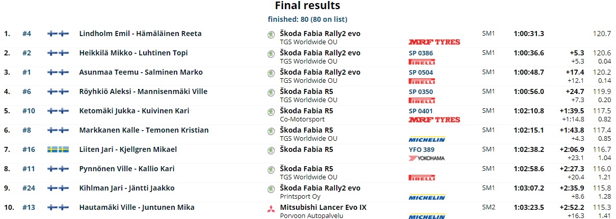Il Team MRF Tires vince il quarto impegno del Campionato Finlandese, ovvero il Pohjanmaa Ralli con Emil Lindholm e Reeta Hämäläinen a bordo di Skoda Fabia Rally2 Evo. Sbaragliata dunque la forte concorrenza dei leader mondiali Pirelli e Michelin.