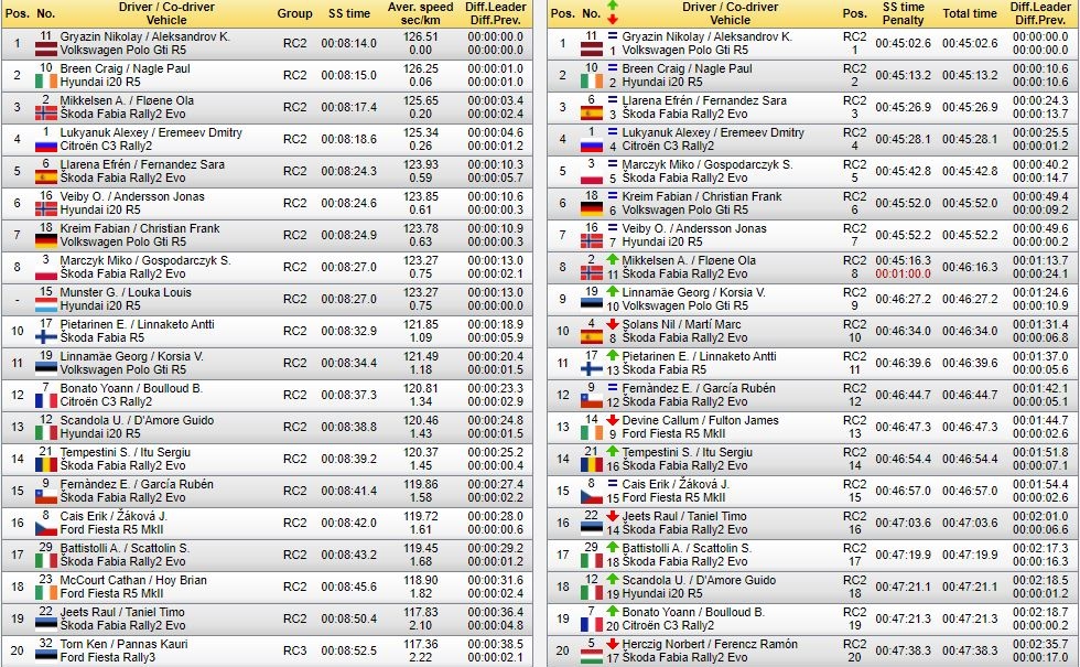 Non è però di questo avviso Craig Breen che con Paul Nagle seguono Gryazin a soli 10,6 secondi, pronti ad approfittare di ogni occasione con la loro 120 R5 e le gomme MRF.
