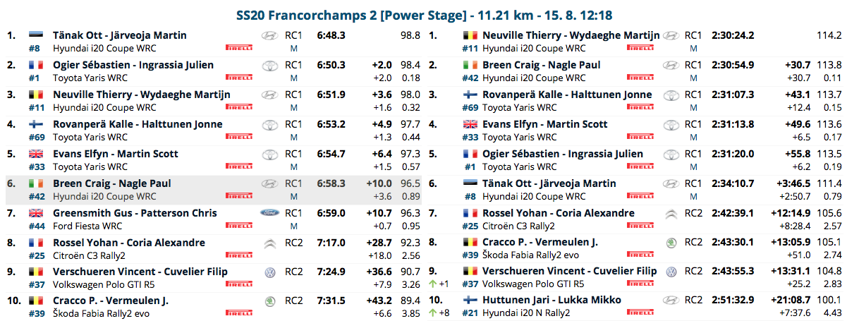 Weekend difficile invece per il campione del mondo e leader del mondiale Sebastien Ogier, mai a suo agio fra le strette stradine belghe. Il francese chiude quinto dietro ad Evans e cede qualche punto nella generale, anche se il margine sugli avversari rimane confortante.