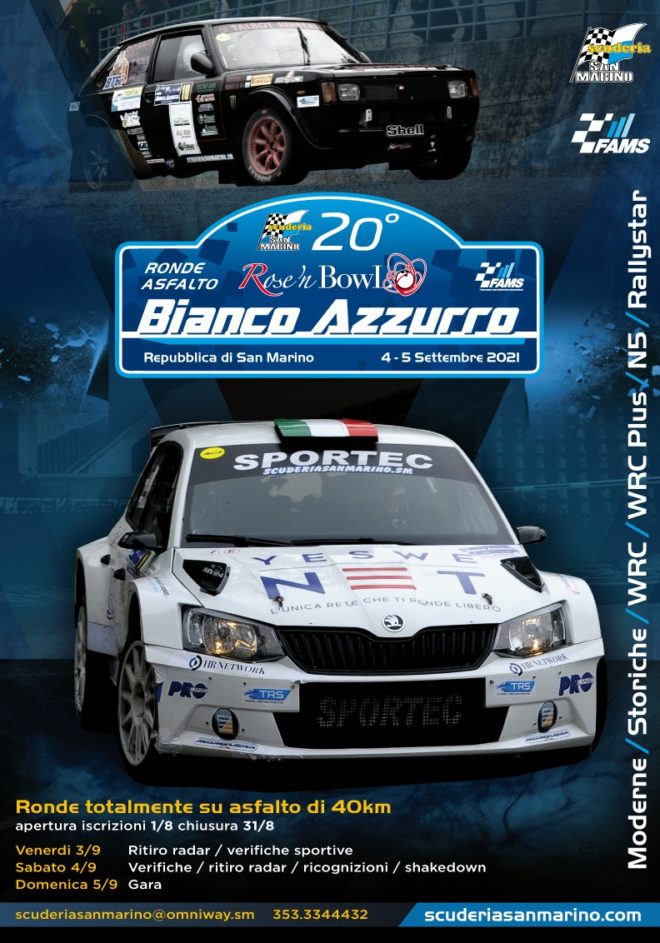 È tutto pronto per il 20esimo Rally Bianco-Azzurro, in programma nel week-end a San Marino. Per l’occasione si correrà con la formula del Rally Ronde, con una prova speciale molto spettacolare, di circa 10 km, da ripetere 4 volte. Il parco assistenza è in zona Cà Chiavello, a Faetano nella Repubblica di San Marino. La prova speciale va da Fonte dell’Ovo a Chiesanuova.