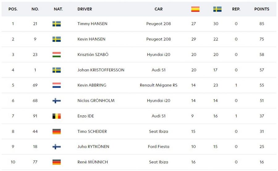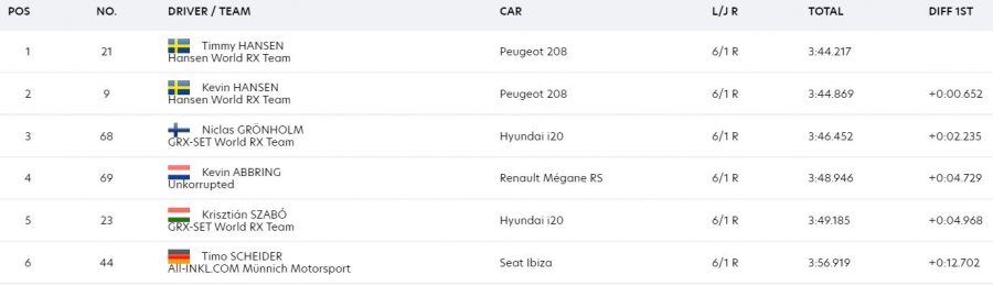 Alla fine delle quattro manche, era in testa il campione in carica Johan Kristoffersson che stava conducendo con sicurezza anche la sua semifinale quando un problema al cambio lo ha costretto a stringere i denti e lottare duramente con Abbring per strappare il terzo posto che gli consentiva l’accesso alla finale. Purtroppo però il suo sforzo e quello dei suoi meccanici ,che hanno sostituito il cambio a tempo di record, non ha pagato: la sua auto non è riuscita a schierarsi in pista per la finale entro il tempo limite ed è quindi stato Kevin Abbring ad approfittare di questa debacle.