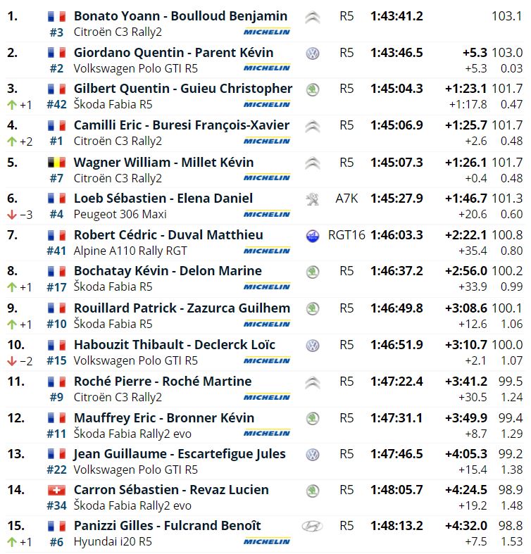 E così Sebastien Loeb a Daniel Elena si prendono il lusso di chiudere sesti assoluti (erano terzi prima di noie al motore e cambio sull’ultima prova) vincendo una PS e terminandone altre 2 tra i primi tre. La sfida con Francois Delecour non si è mai infiammata a causa di problemi al cambio della vettura gemella che hanno prima rallentato e poi escluso Delecour. Nota di colore: era presente un’altro mattatore degli anni Novanta e Duemila: Gilles Panizzi, che chiude 15mo assoluto su Hyundai i20 R5.