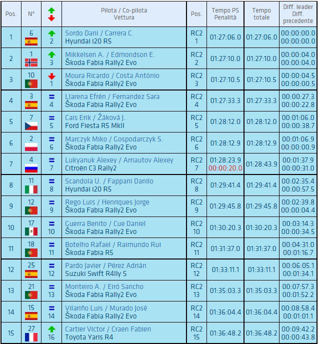 La classifica è comunque cortissima con Sordo, Moura e Mikkelsen in 4,5 secondi, poi a seguire Llarena a 27 e Cais, bravo ad evitare guai ma ad oltre 1 minuto.