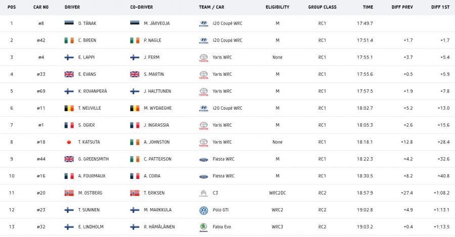 Alla fine Tänak e Breen erano due dei maggiori favoriti alla vigilia, per cui tutti ci aspettavamo di trovarli in cima alla classifica, mentre invece chi ha veramente impressionato è Esapekka Lappi che, nonostante non guidasse una WRC sulla terra da un anno, ha subito trovato il feeling giusto, realizzando ottimi tempi (anche aiutato dall’ordine di partenza) e piazzandosi al terzo posto, primo tra i piloti Toyota!