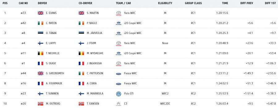 Alla fine del primo giro di prove Evans fa quattro su quattro e estende il suo vantaggio su Breen fino a 5,6 secondi, subito dietro Tanak a 9,7. Quarto Lappi che approfitta del ritiro di Rovanpera e potrebbe avere anche qualche secondo indietro per aver rallentato passando davanti all’auto di Kalle. Out Anche Gryazin per doppia foratura.