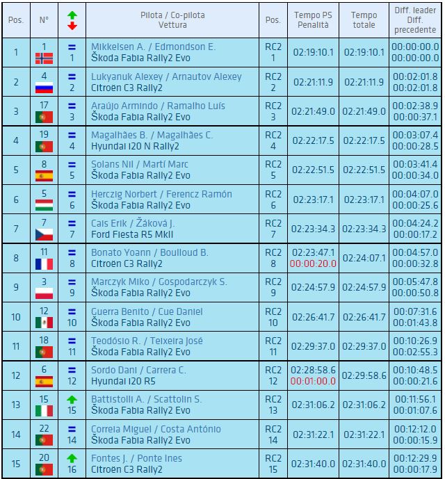 Completa il podio Armindo Araújo, bravo a stare il più possibile fuori dai guai sabato e a vincere, con questo piazzamento, il campionato nazionale portoghese. Finisce tredicesimo Alberto Battistolli, felice sicuramente di essere uscito indenne da questa difficile gara. Buoni tempi nella seconda parte della giornata per Simone Campedelli e Umberto Scandola, spesso a ridosso dei primissimi ma purtroppo indietro in classifica dopo i ritiri di ieri.