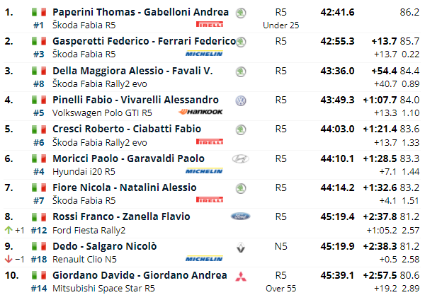 Ottavi sono giunti Rossi-Zanella, con la Ford Fiesta R5, autori di una aggressiva seconda parte di gara, con  la quale hanno avuto ragione all’ultimo tuffo di “Dedo” -Salgaro, noni con la Renault Clio N5, che il pilota di Teramo sta sviluppando per il mercato italiano. Decimi chiudono i fratelli Davide e Andrea Giordano, con la Mitsubishi Space Star che, con le nuove migliorie tecniche in diversi comparti vettura hanno trovato il secondo arrivo consecutivo dopo quello di inizio settembre a Reggello.