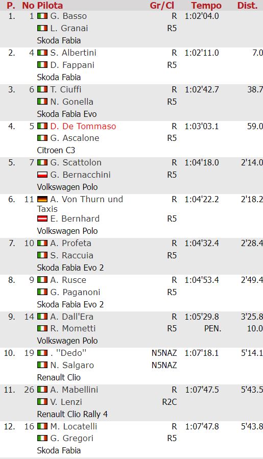 Strada spianata quindi non solo per Basso ma anche Albertini a cui basta il secondo posto per laurearsi campione del CIRA. Dietro i due campioni nazionali in pectore, conquista il suo primo podio nel CIR Tommaso Ciuffi con Nicolo Gonella. Un campionato sicuramente in crescendo per il pilota toscano che si conferma uno dei giovani piĂą promettenti del panorama nazionale.