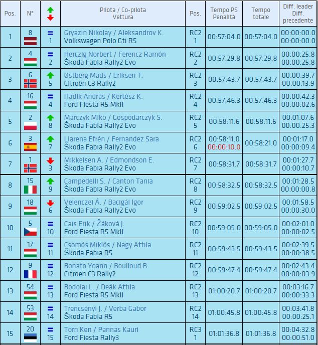 Foratura anche per Mikkelsen, accompagnata da problemi tecnici al motore che hanno decisamente limitato le prestazioni del norvegese, attualmente al settimo posto, ma comunque in pieno controllo dal punto di vista del campionato. Infatti i suoi più diretti inseguitori, Miko Marczyk e Efrén Llarena, sono solo quinto e sesto, decisamente troppo poco per colmare gli oltre 70 punti di vantaggio di Mikkelsen che, numeri alla mano, in questo momento sarebbe virtualmente campione ERC con una gara d’anticipo.