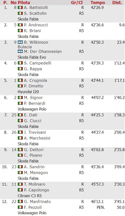 Se al primo posto ha chiuso un giovane Italiano che si sta facendo strada, al secondo c’è quel vecchio leone di Paolo Andreucci che ha eguagliato in numero di prove vinte Alberto e ha chiuso a 9,6 secondi da lui. Quanto basta per acciuffare il CIRT e regalare a MFR il primo alloro nazionale. Ottima gara anche la sua, non solo veloce ma anche accorta, soprattutto dopo l’uscita di stamattina di Scandola che gli ha “lasciato strada” verso la conquista del campionato. In ogni caso il toscano doveva chiudere almeno secondo e la lotta con Bulacia è stata tosta fino alla sesta prova, dopodiché Andreucci ha iniziato a prendere un vantaggio che Bruno Bulacia non aveva nemmeno interesse a colmare. Il 19enne boliviano ha comunque concluso al terzo posto.