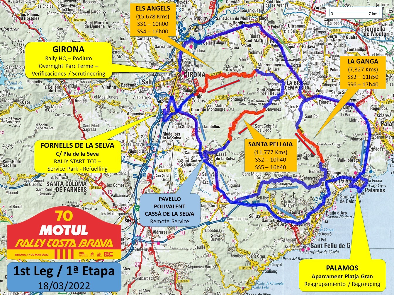 Raduno giovedì 17 marzo , giorno riservato alle verifiche tecniche amministrative e obbligatorie. Il parco servizi e il Villaggio saranno ancora una volta situati a Fornells de la Selva , in una zona ampia e a pochi minuti dal centro di Girona. Nel parcheggio del Pont de Pedret, a Girona, ci sarà il parco chiuso e il podio del rally. La cerimonia di partenza del Rally 70 Motul Costa Brava si svolgerà alle 18.30.
