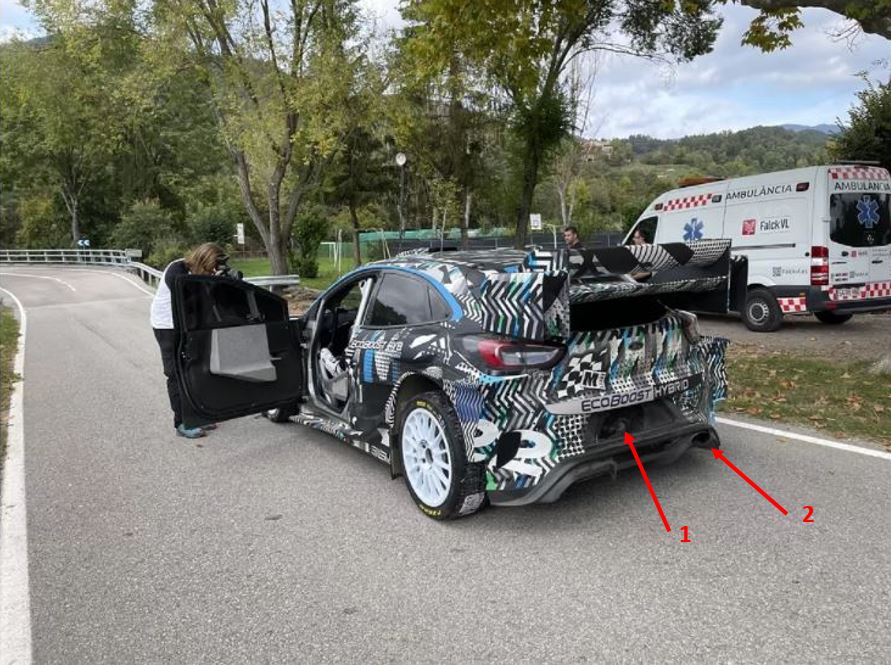 Come si vede ad esempio sulla Puma, questa apertura (1 in figura sotto) e tutto il layout interno della zona hanno causato lo spostamento dello scarico verso il lato destro (2 in figura sotto), rispetto a quanto accadeva sulle WRC Plus.