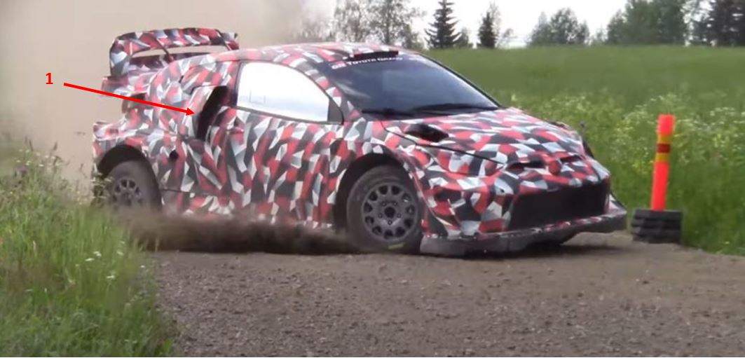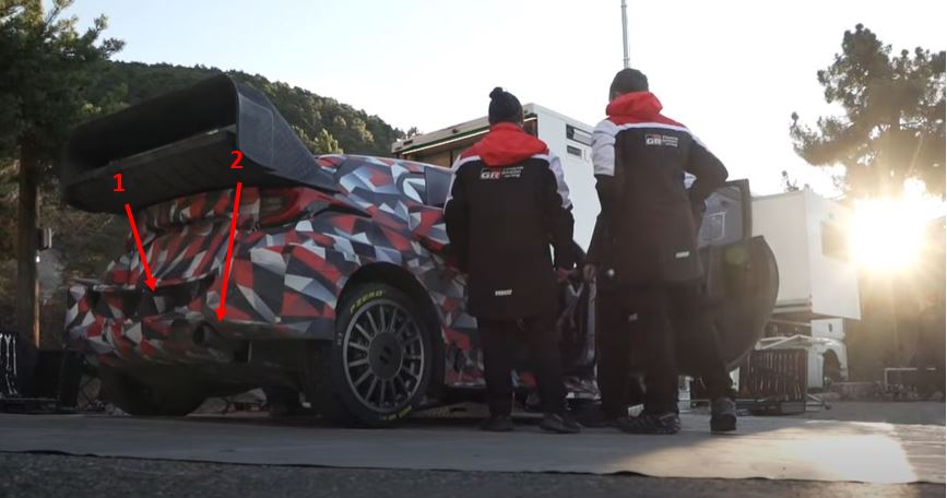 Toyota sembra aver seguito la strada tracciata da M-Sport: anche in questo caso ritroviamo una vistosa apertura centrale e lo scarico spostato sulla destra (1 e 2 in figura sotto).