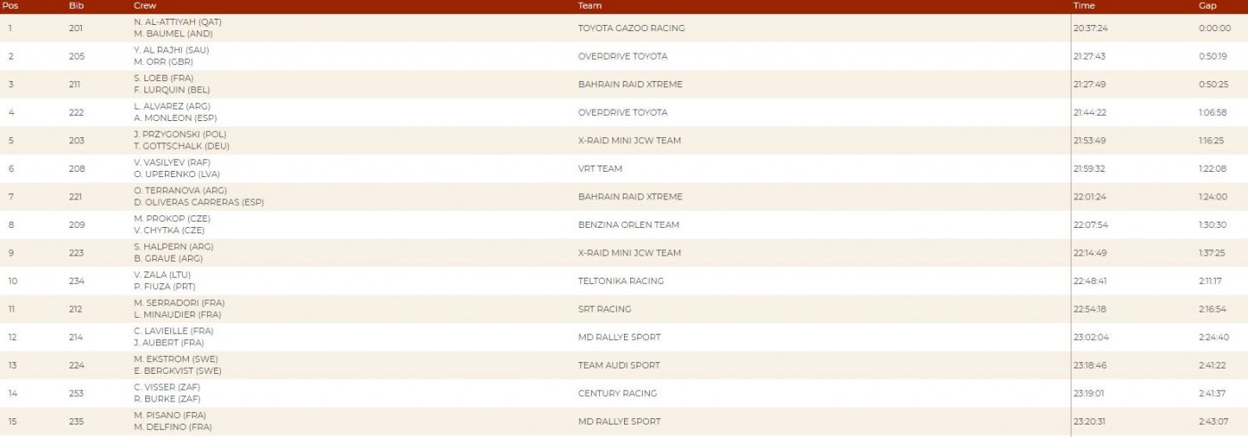 E quella assoluta, con il sorpasso di Al-Rajhi ai danni di Loeb e con l’ingresso nella top ten di Vaidotas Zala con la Mini JCW 4×4, prima delle auto con ruote “piccole” (245/80 R16)