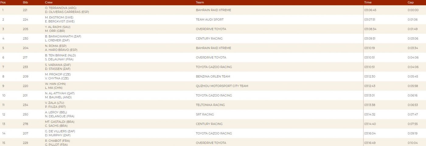 A primeggiare oggi è stato invece l’esperto argentino Orlando Terranova che con la terza BRX Hunter che ha preso la testa a una novantina di chilometri dal traguardo e non l’ha più lasciata. Dietro di lui Mattias Ekstrom che sembra essere l’unico in grado di sfruttare il rendimento della RS Q E-tron senza accusare problemi meccanici. Terzo Yazeed Al-Rajhi che con questo piazzamento scavalca Loeb in seconda posizione assoluta.