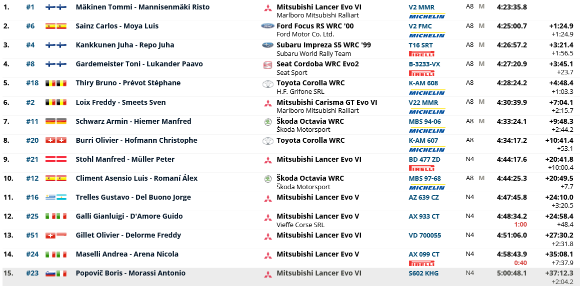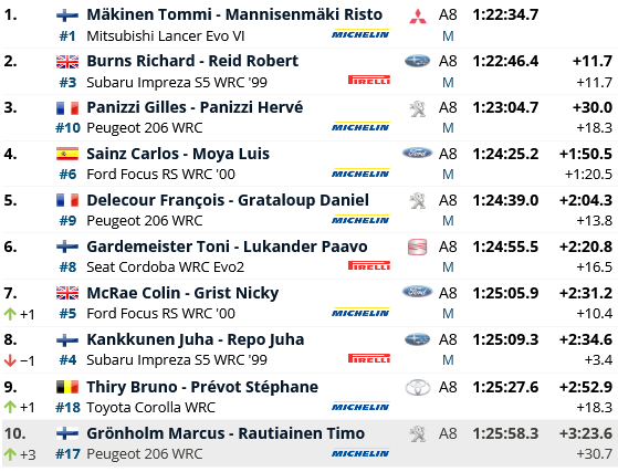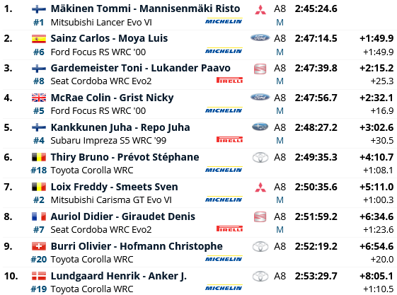 Quasi 34 km dove i piloti di Wilson giocheranno al gatto e al topo, dove Colin deve inseguire Carlos. Purtroppo però il motore della Ford numero 5 si rompe e costringe Mcrae al ritiro, lasciando il via libera per la piazza d’onore al Matador. Il gradino più basso del podio va invece a Juha Kankkunen, bravo a rimontare con piede ed esperienza ed a mai forzare il passo con la Impreza Wrc. Quarto posto finale per Toni Gardemeister, autore di una gara pazzesca e costantemente più veloce del suo compagno più esperto Didier Auriol. Il francese, mai pienamente a suo agio alla prima uscita con la Seat Cordoba, si vede addiritura costretto al ritiro lungo la ps14 a causa di un guasto al motore. Certamente non il debutto che si aspettava la squadra spagnola. Degno di nota anche il quinto posto assoluto conseguito da Bruno Thiry. Il pilota belga, ormai riconosciuto come un veterano del World Rally Championship, è autore di una gara magistrale e dimostra che la probabilmente la Toyota Corolla Wrc avrebbe potuto dire la sua ancora per qualche stagione.