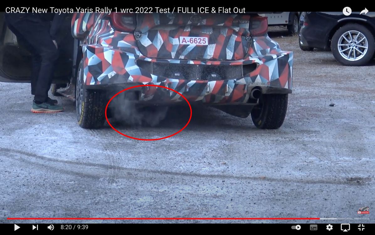 Al minuto 8:20 di vede la Yaris nuovamente ferma, e l’inquadratura posteriore ci ripresenta l’allucinazione dei primi secondi: il fumo che esce dal sotto scocca e dallo scarico, niente.