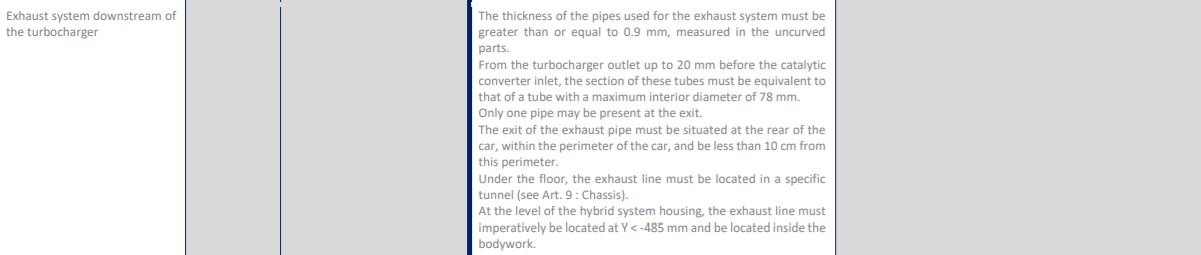 “All’uscita può essere presente solo un tubo. L’uscita del tubo di scarico deve essere posizionato nella parte posteriore della vettura, deve essere all’interno del perimetro della vettura, e deve essere non piĂą distante di 10 centimetri dal perimetro della vettura”