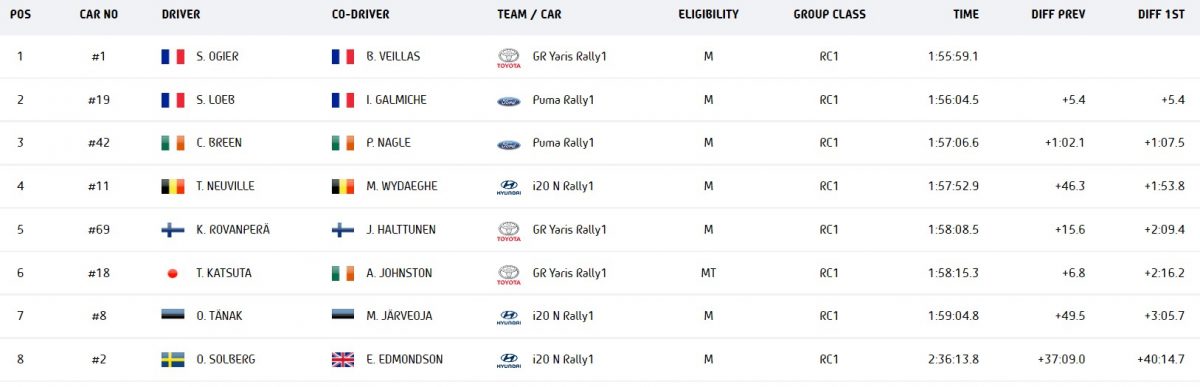 Ottimo risveglio per Kalle Rovanpera, autore del secondo tempo assoluto. Il giovane finlandese sta prendendo confidenza con la nuova Yaris Rally1 adattandola, come dichiarato da lui stesso, alla sua guida. Segue dunque Sebastien Ogier, che rosicchia nella classifica generale oltre 3″ al leader Loeb (settimo tempo in questa prova speciale, ndr). Quarto tempo per Neuville, precedendo Breen e Katsuta. Molto cauto e conservativo Oliver Solberg, autore del nono tempo a +15.9 dalla vetta.